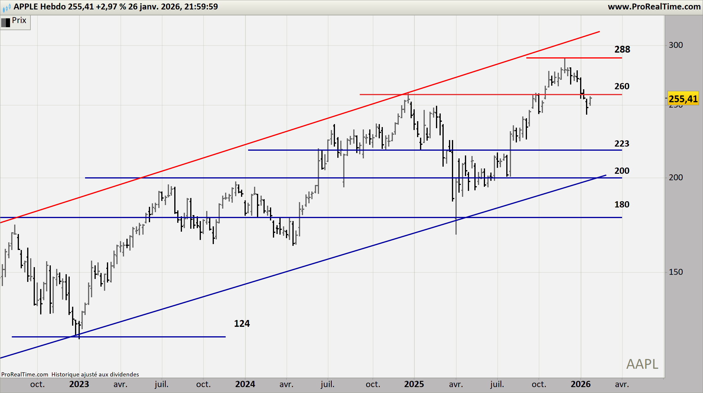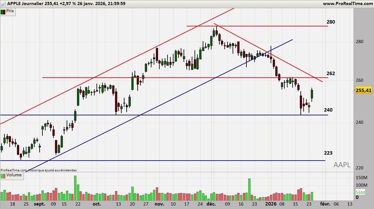 En hebdomadaire, Apple consolide sous 260 USD, niveau pivot pour relancer la dynamique.