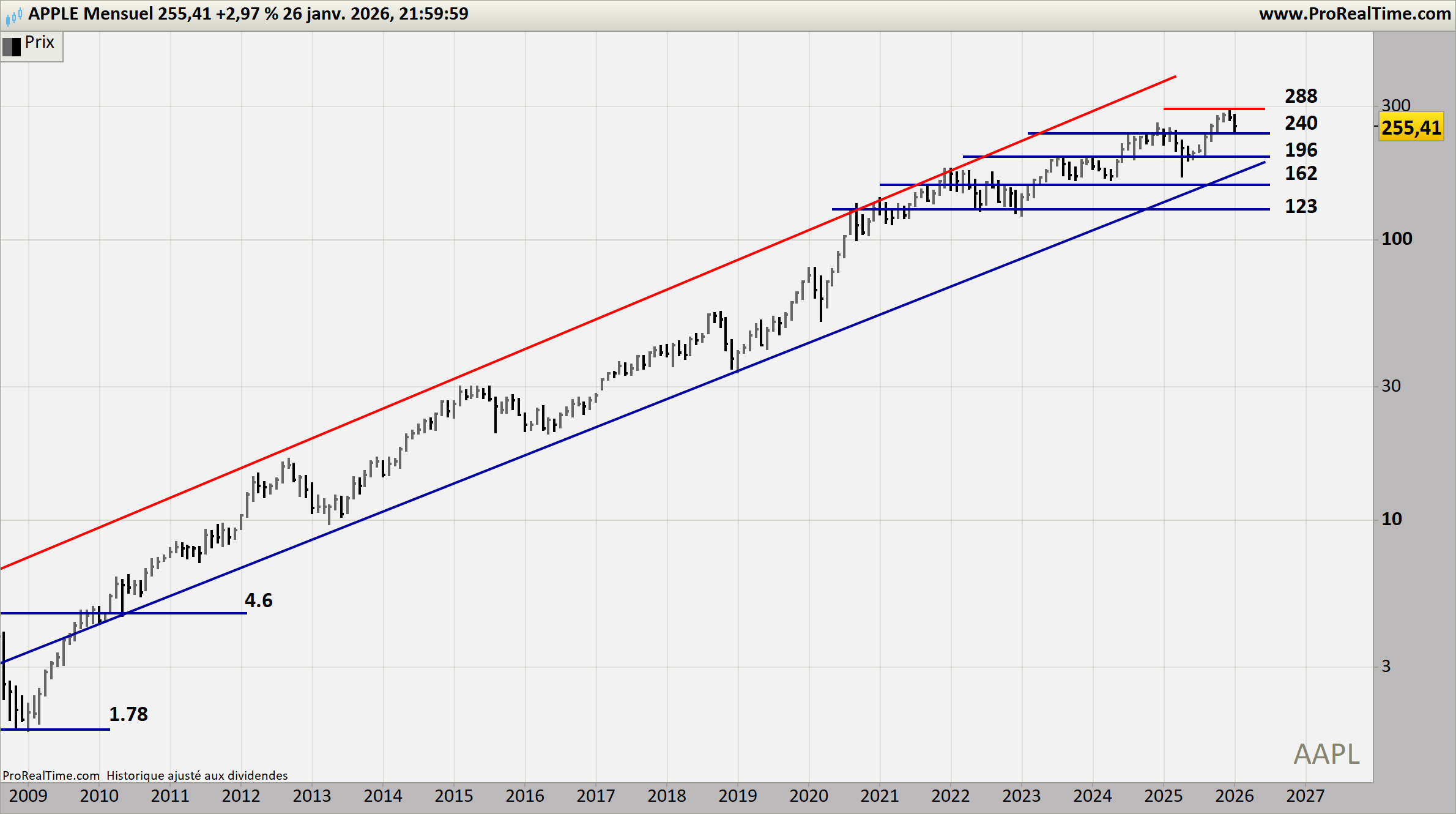 Le titre évolue dans un canal haussier de long terme, porté par la stabilité des marges et la puissance de l’écosystème. La zone 210–230 USD constitue un socle stratégique. Tant que ce niveau tient en clôture mensuelle, le super‑cycle reste valide.
