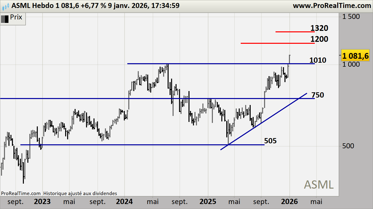 ASML évolue dans l’une des tendances haussières les plus régulières du marché mondial. Sur le long terme (Monthly), le titre reste inscrit dans un canal ascendant d’une remarquable stabilité, avec une pente annualisée proche de 29% depuis plus d’une décennie. La cassure récente de la zone 980–1010 USD valide une reprise de la dynamique primaire, soutenue par des volumes en expansion et une structure de prix propre.