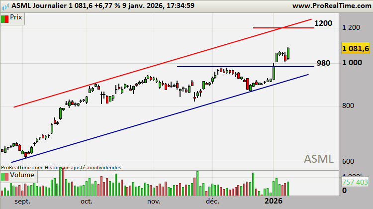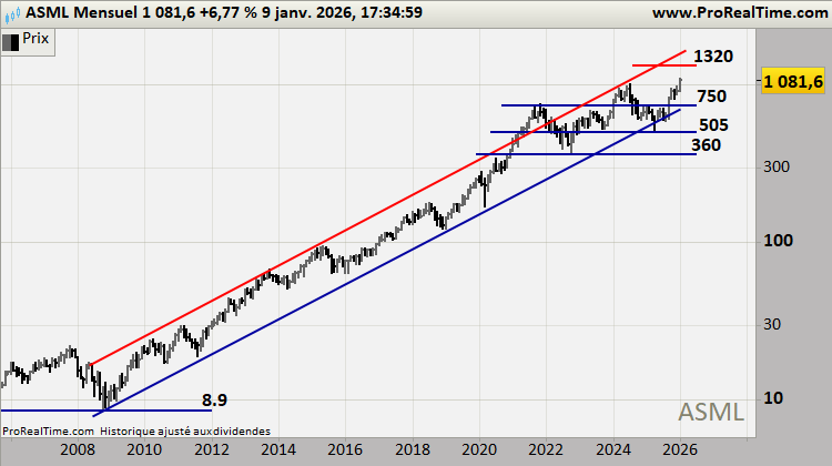 ASML est l’un des actifs les plus stratégiques du cycle actuel : un monopole technologique mondial, un moteur structurel de l’IA, et une valeur inscrite dans un canal haussier d’une rare régularité. Sa combinaison unique de visibilité, de croissance et de domination industrielle en fait un pilier naturel de LA‑25.
