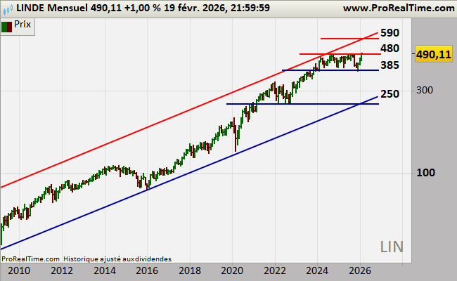 (Graphique Linde Monthly) Sortie au-delà de 480 U%SD, dans un volume satisfaisant, mais pas explosif. Les 480 USD suggèrent quelques achats.