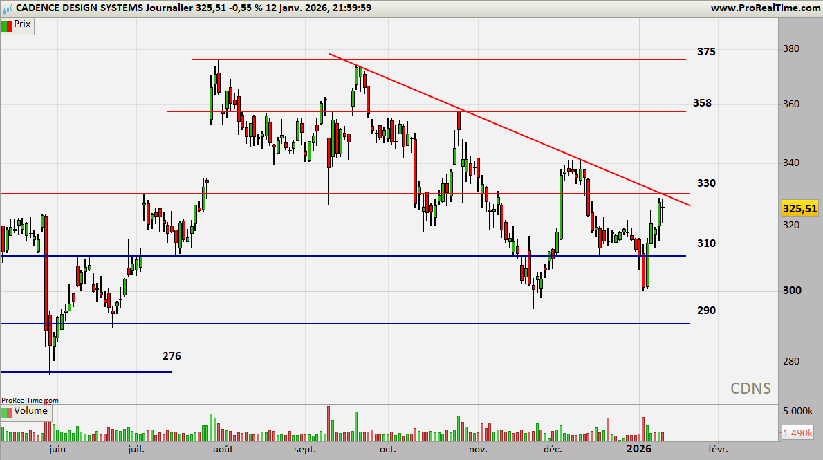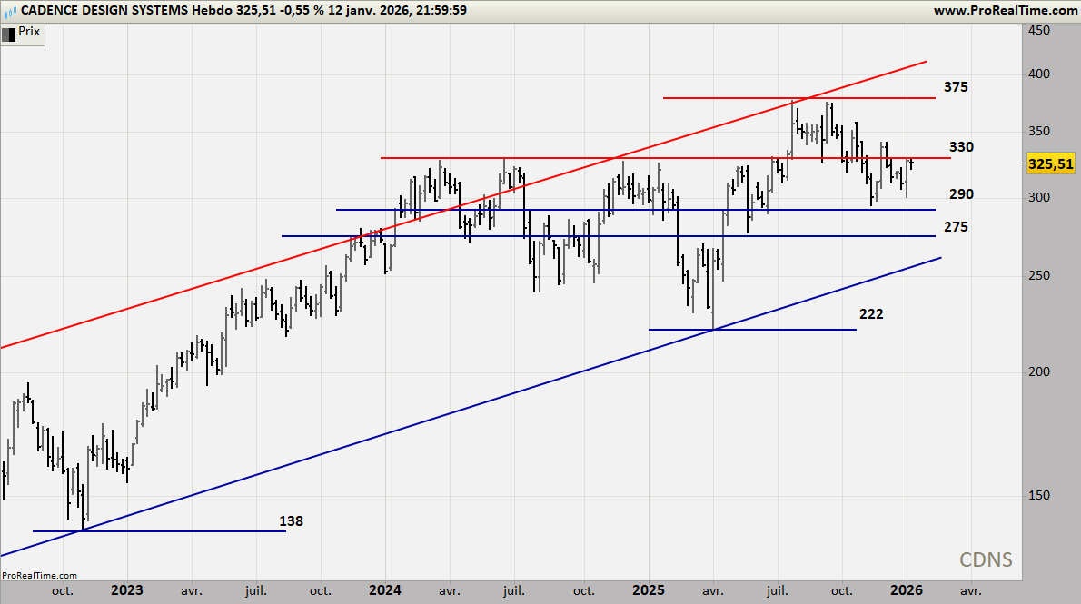 Cadence reste inscrite dans un canal haussier exceptionnel depuis 2008 (+30%/an). La consolidation touche à sa fin sur le support majeur 290 USD. Un dépassement de 330 USD ouvrirait la voie vers 375 USD et de nouveaux records.