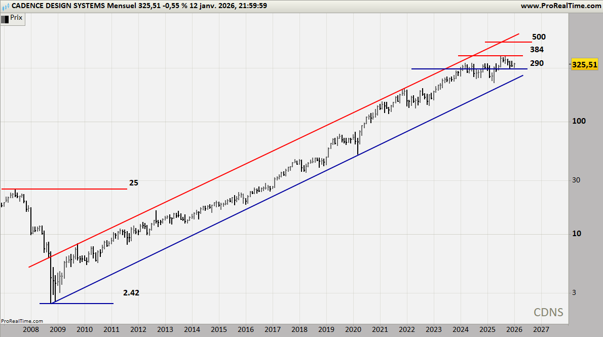 Cadence évolue depuis plus de quinze ans dans un canal haussier d’une remarquable régularité, avec une pente annualisée proche de 30%. La consolidation récente reste contenue dans la partie médiane du canal, avec un support majeur à 290 USD. La structure long terme demeure intacte : tendance primaire haussière, volumes cohérents, dynamique structurelle préservée.