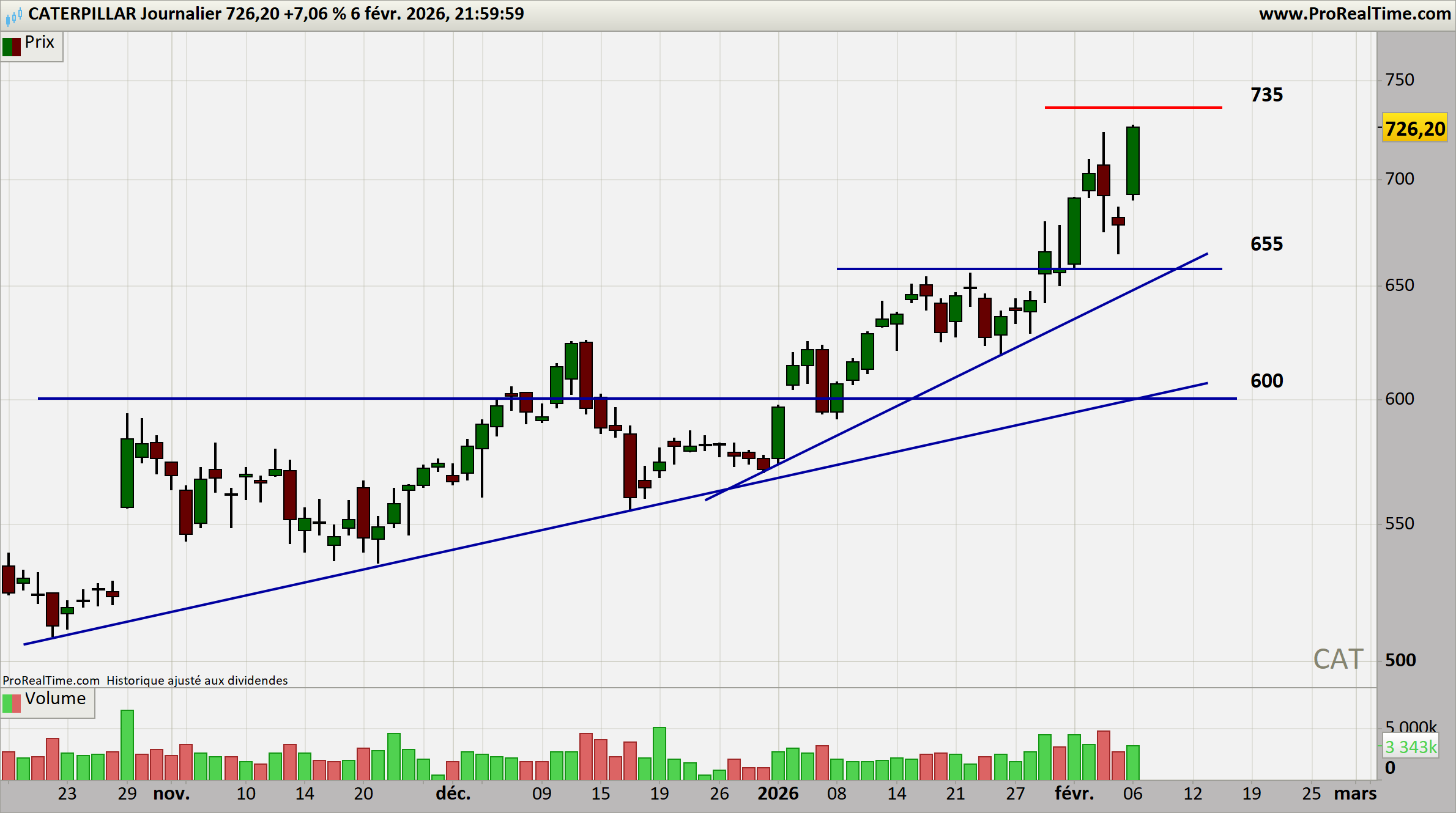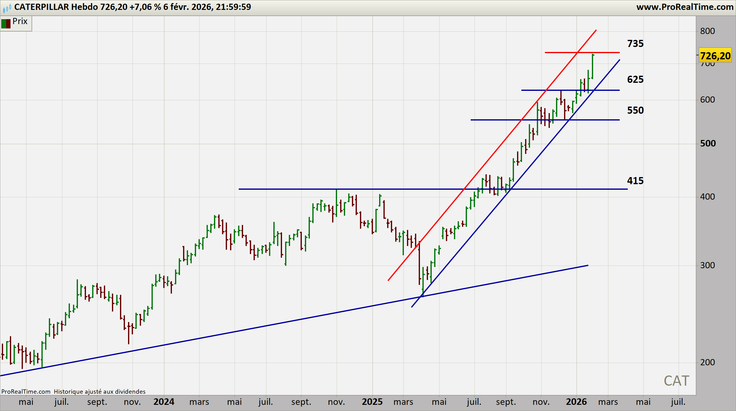 Caterpillar évolue dans une tendance haussière majeure, soutenue par un momentum puissant. Les niveaux techniques sont nets, les supports sont solides, et la dynamique reste constructive tant que les prix se maintiennent au‑dessus de 655 USD. Le titre reste en extension mais sans excès.