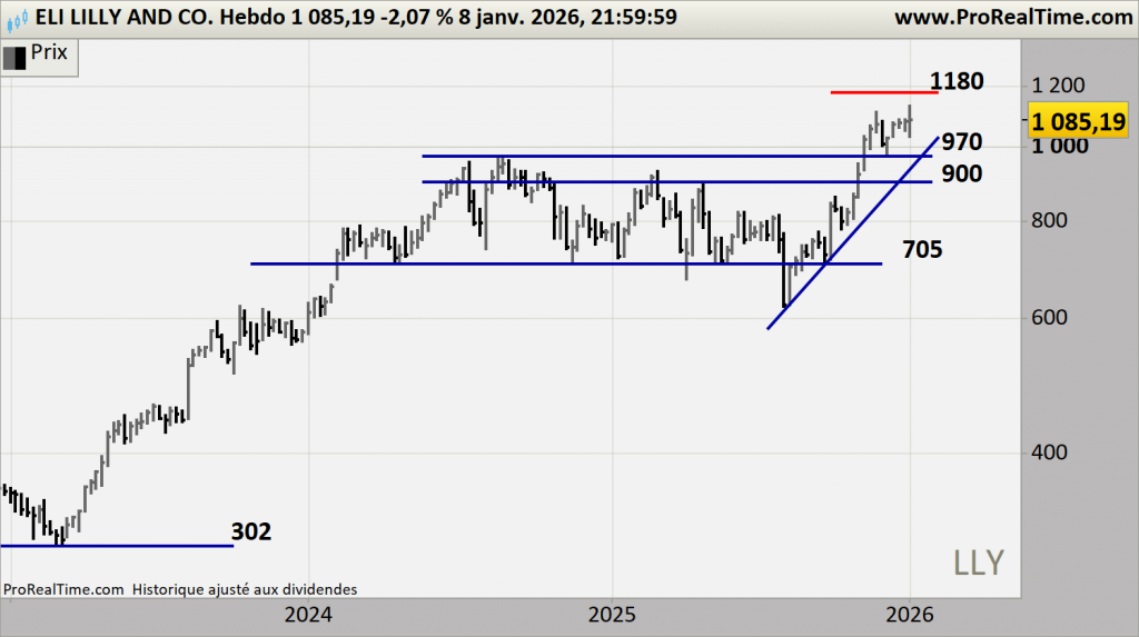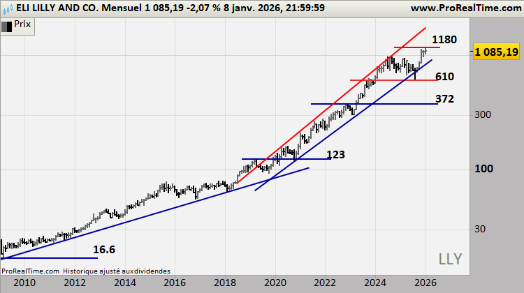 Eli Lilly s’impose comme l’acteur pharmaceutique le plus puissant du cycle actuel, porté par une dynamique exceptionnelle dans les traitements métaboliques (obésité, diabète) et un pipeline d’innovation d’une profondeur rare. L’explosion mondiale de la demande en GLP‑1 a créé un nouveau paradigme : Lilly n’est plus un laboratoire parmi d’autres, mais le moteur structurel d’un marché en expansion durable, avec une visibilité exceptionnelle sur la croissance, les marges et les révisions bénéficiaires. Avec des anticipations relevées trimestre après trimestre, une exécution clinique et commerciale irréprochable, et une avance stratégique sur les concurrents, Eli Lilly s’affirme comme un pilier défensif‑offensif, capable de surperformer en marché haussier comme en période de stress.