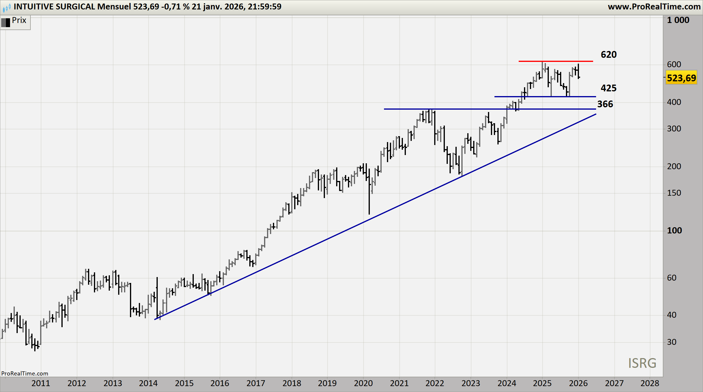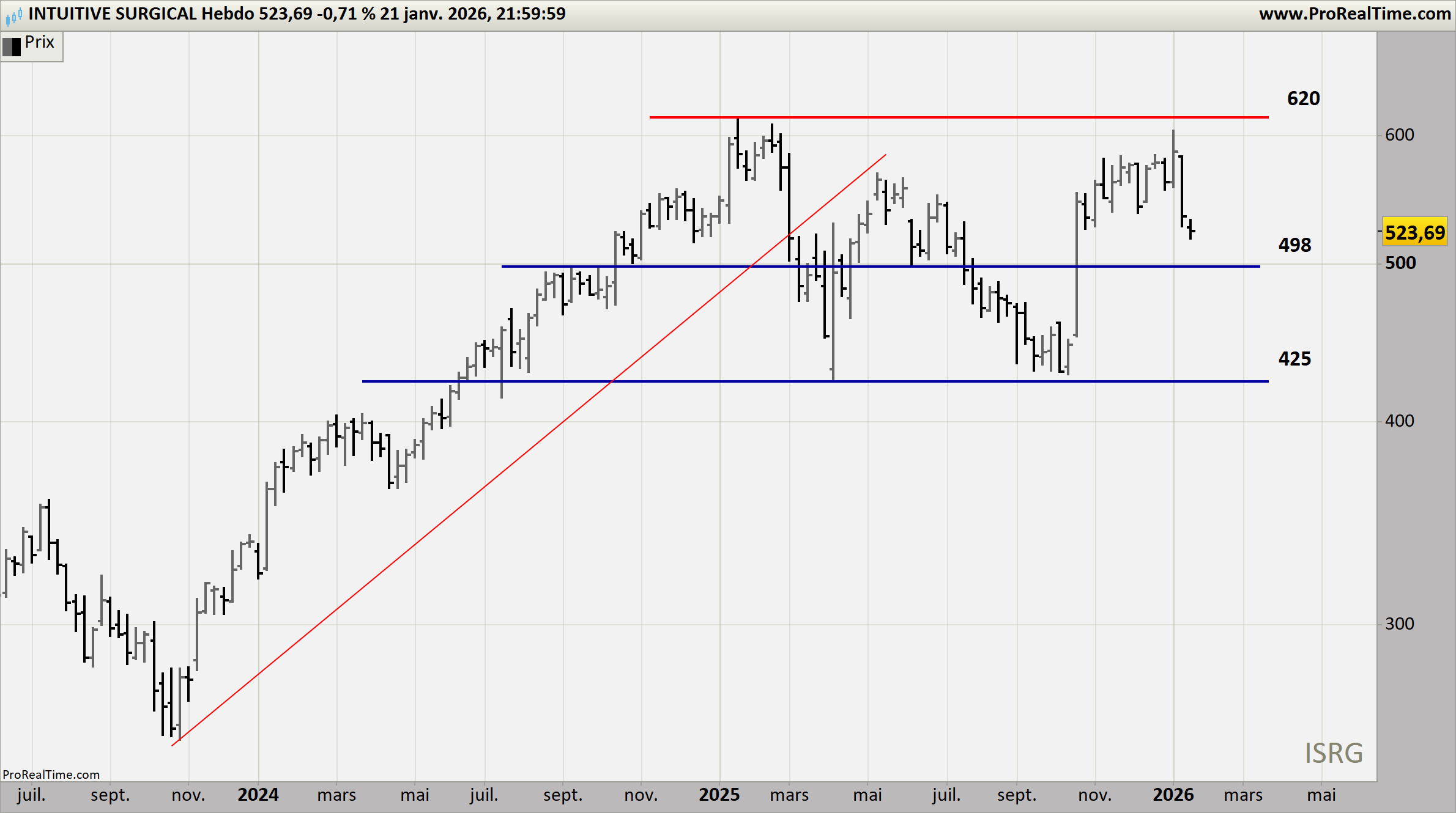 Intuitive Surgical évolue dans une large consolidation depuis la sortie d’un oblique haussier en mars 2025. Le titre a formé un double sommet sous 620 USD, niveau qui constitue désormais la résistance majeure du cycle. Le support 525 USD est attractif mais doit impérativement tenir pour préserver la structure. En cas de rupture, 498 USD serait le prochain niveau technique, tandis qu’un comblement du gap vers 468 USD reste un scénario extrême mais peu probable. La dynamique pourrait se réactiver rapidement si les progrès attendus en robotique médicale (Da Vinci 5, ROS, imagerie hyperspectrale, guidance IA) se matérialisent. Une reprise vers 620 USD, puis une sortie de congestion vers de nouveaux records, constitue un scénario crédible.