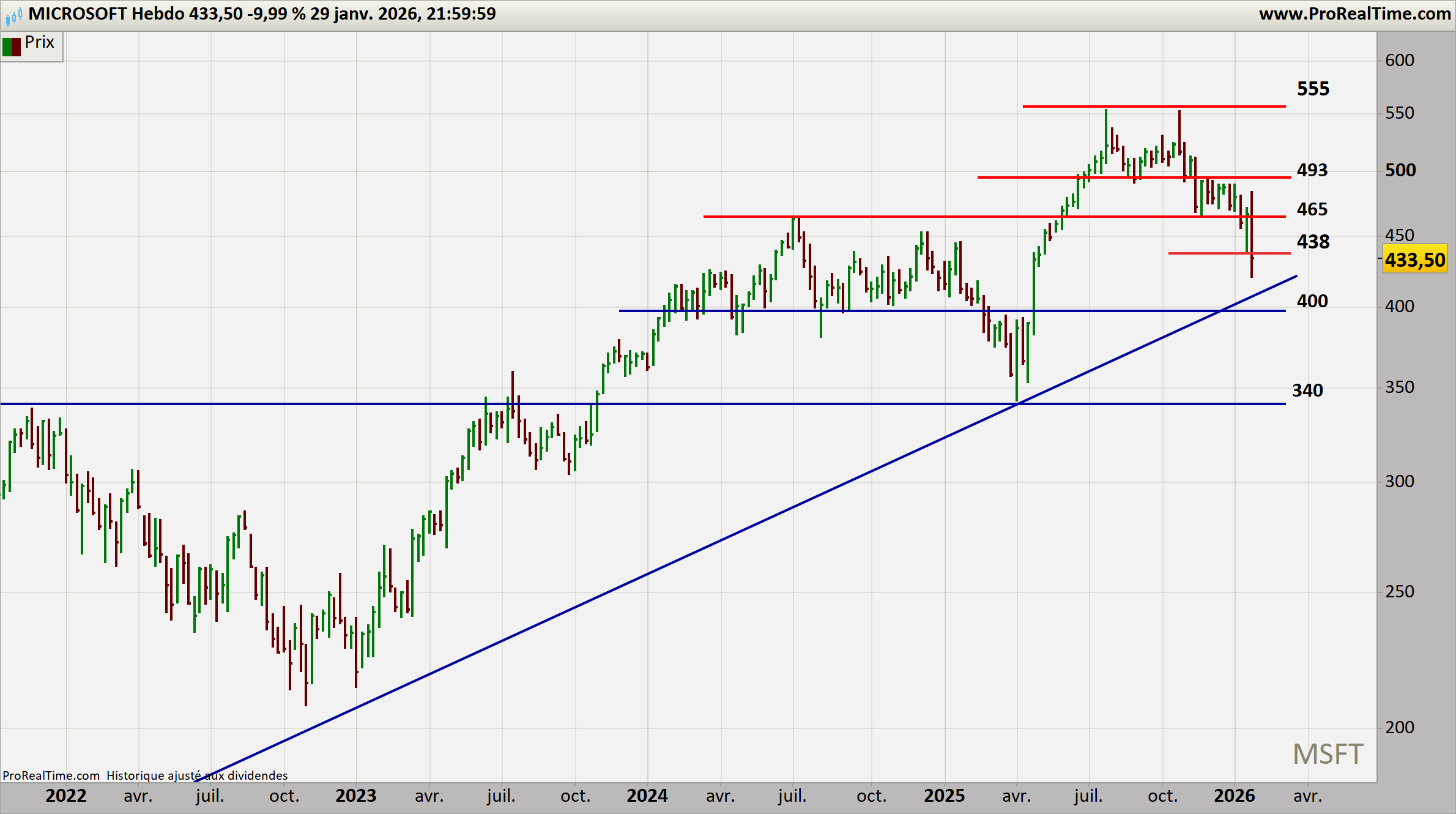 Microsoft reste dans une tendance primaire haussière, mais la dynamique court terme est dégradée. Le support 438 USD est le niveau clé du moment : maintien = stabilisation ; cassure = extension de la correction vers 400 USD. La zone actuelle redevient attrayante pour un investisseur long terme.