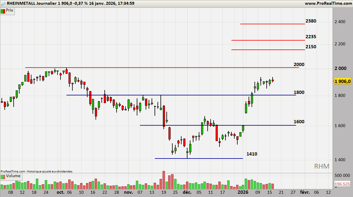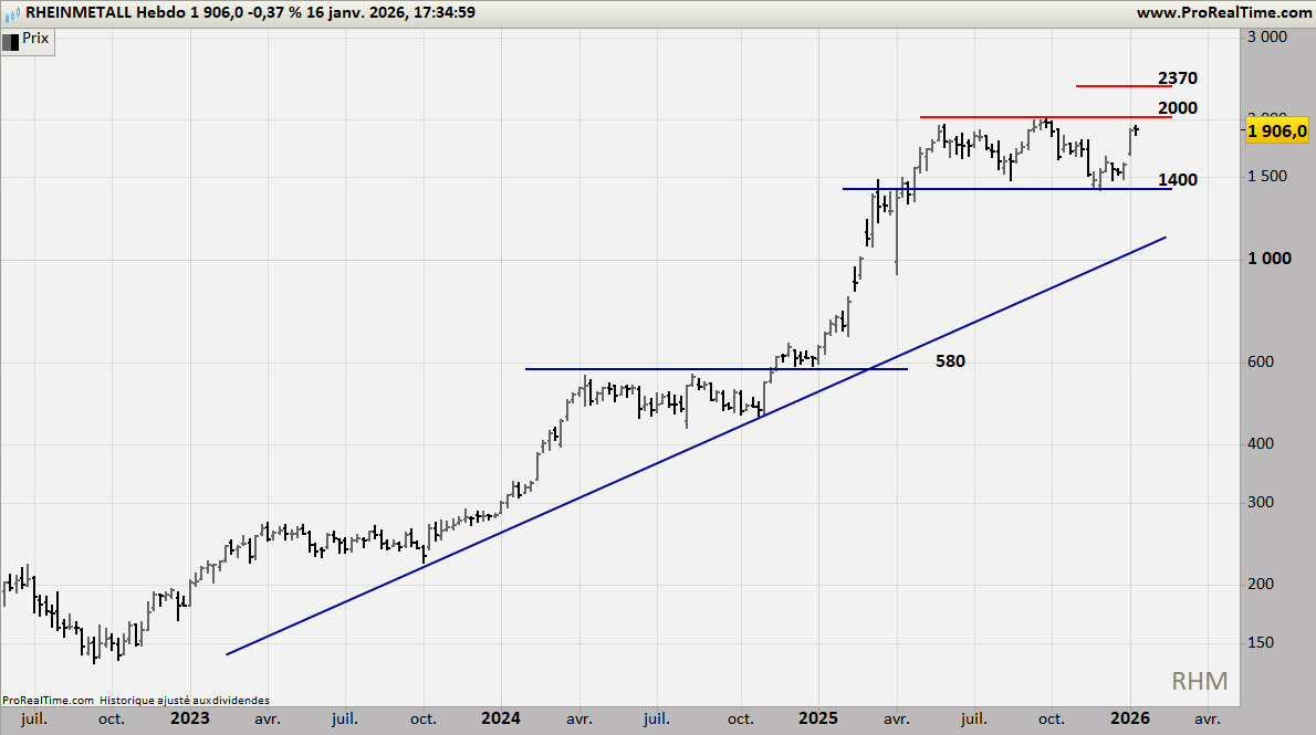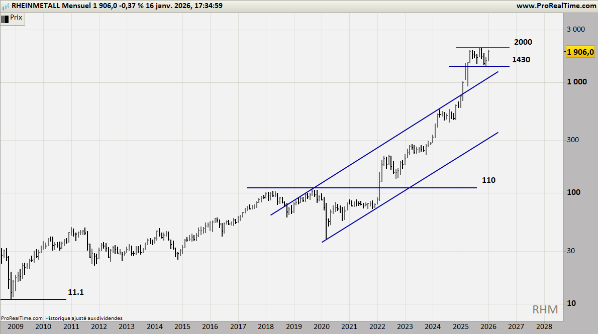 Rheinmetall évolue dans un méga‑trend haussier depuis 2021. La zone 1 430–2 000 € constitue une large congestion de moyen terme. La rupture de 2 000 € validerait la reprise du mouvement primaire.