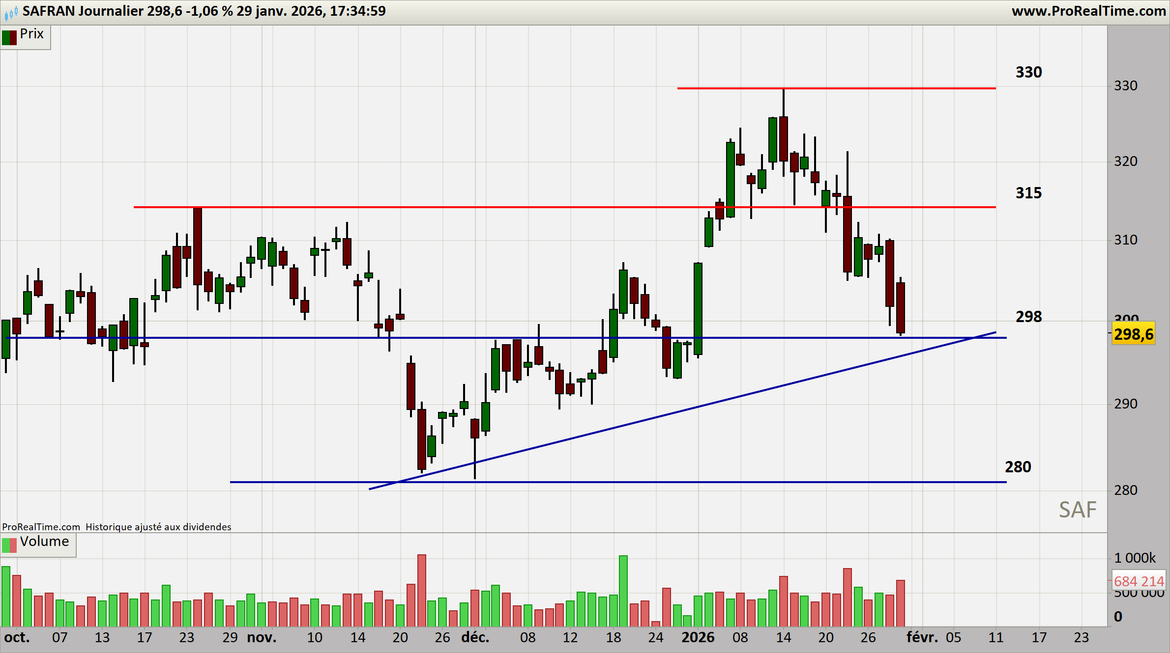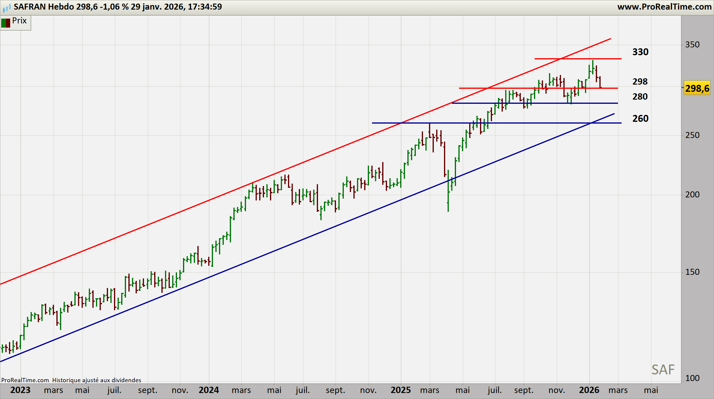 En hebdomadaire, Safran évolue dans un canal haussier propre, avec une compression entre 298 € et 330 €.