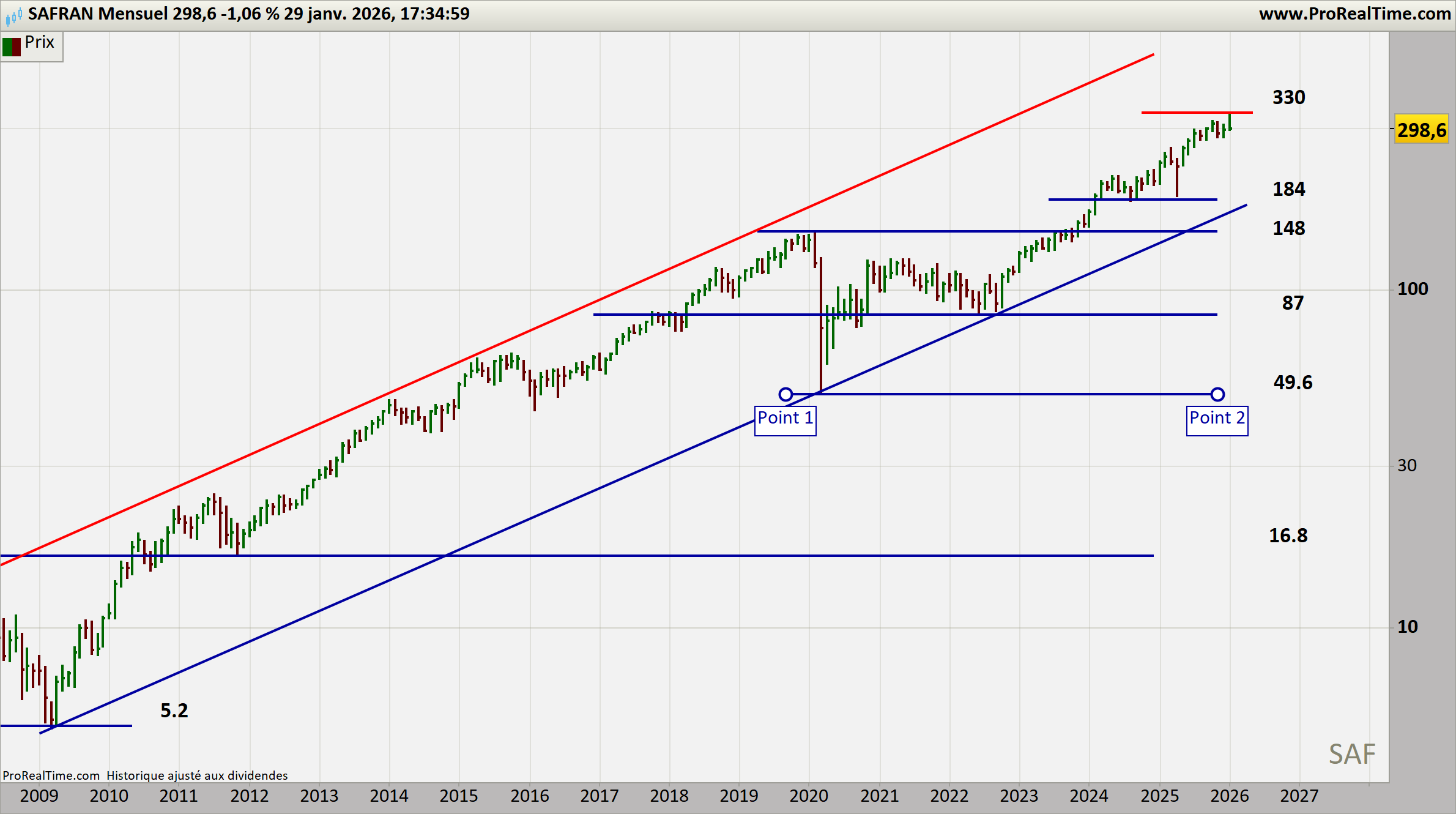 Safran évolue dans une tendance haussière long terme parfaitement construite. La consolidation actuelle sous les sommets reste saine et ordonnée. Les supports 298 € puis 280 € constituent les zones clés. Une reprise durable au‑dessus de 315–330 € relancerait la dynamique.