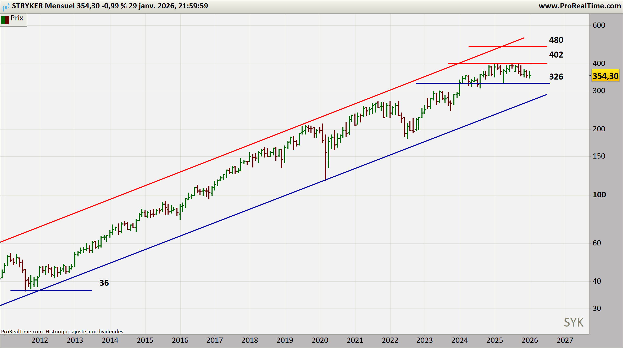 La tendance primaire reste haussière, inscrite dans un canal long terme parfaitement respecté depuis plus de dix ans. La consolidation actuelle s’apparente à une respiration intermédiaire dans un super‑cycle porté par la robotisation chirurgicale et la croissance structurelle du medtech.