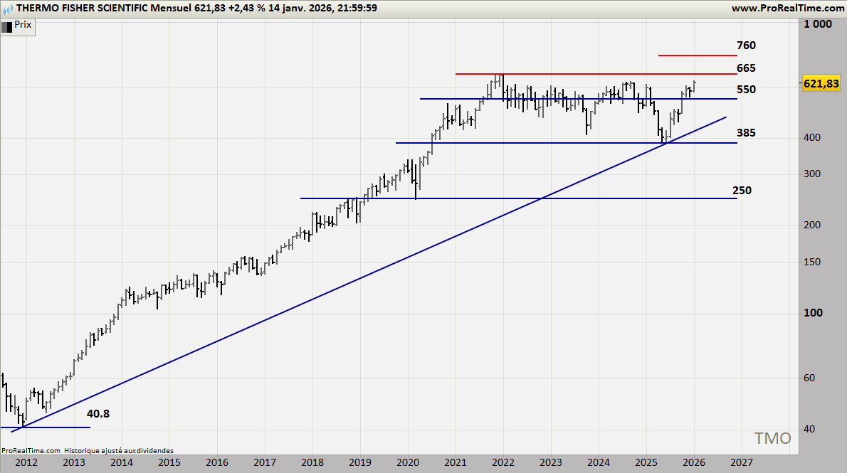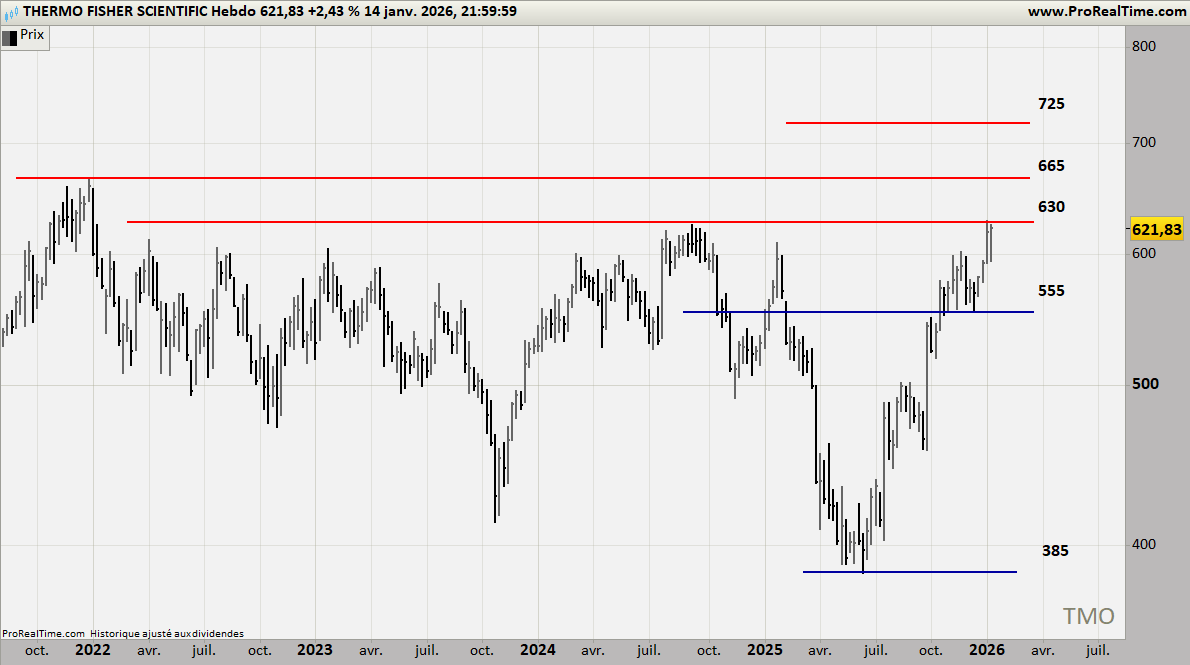 Thermo Fisher évolue dans une configuration technique solide après quatre années de congestion latérale. La zone 630 USD constitue la résistance clé à franchir et convertir en support pour viser le précédent sommet à 665 USD. Les achats sont attractifs dès maintenant en partie, ou tactiquement autour de 600 USD, voire 550 USD en cas de correction improbable. La dynamique est constructive, soutenue par un consensus en hausse et des cours qui progressent de manière cohérente.