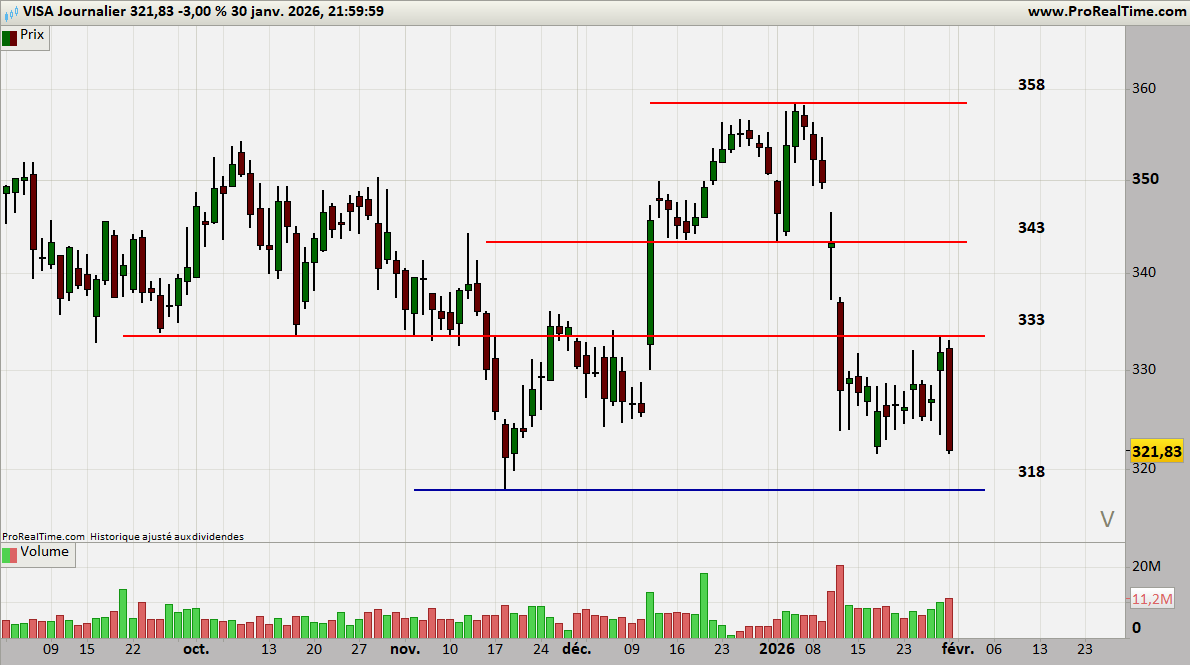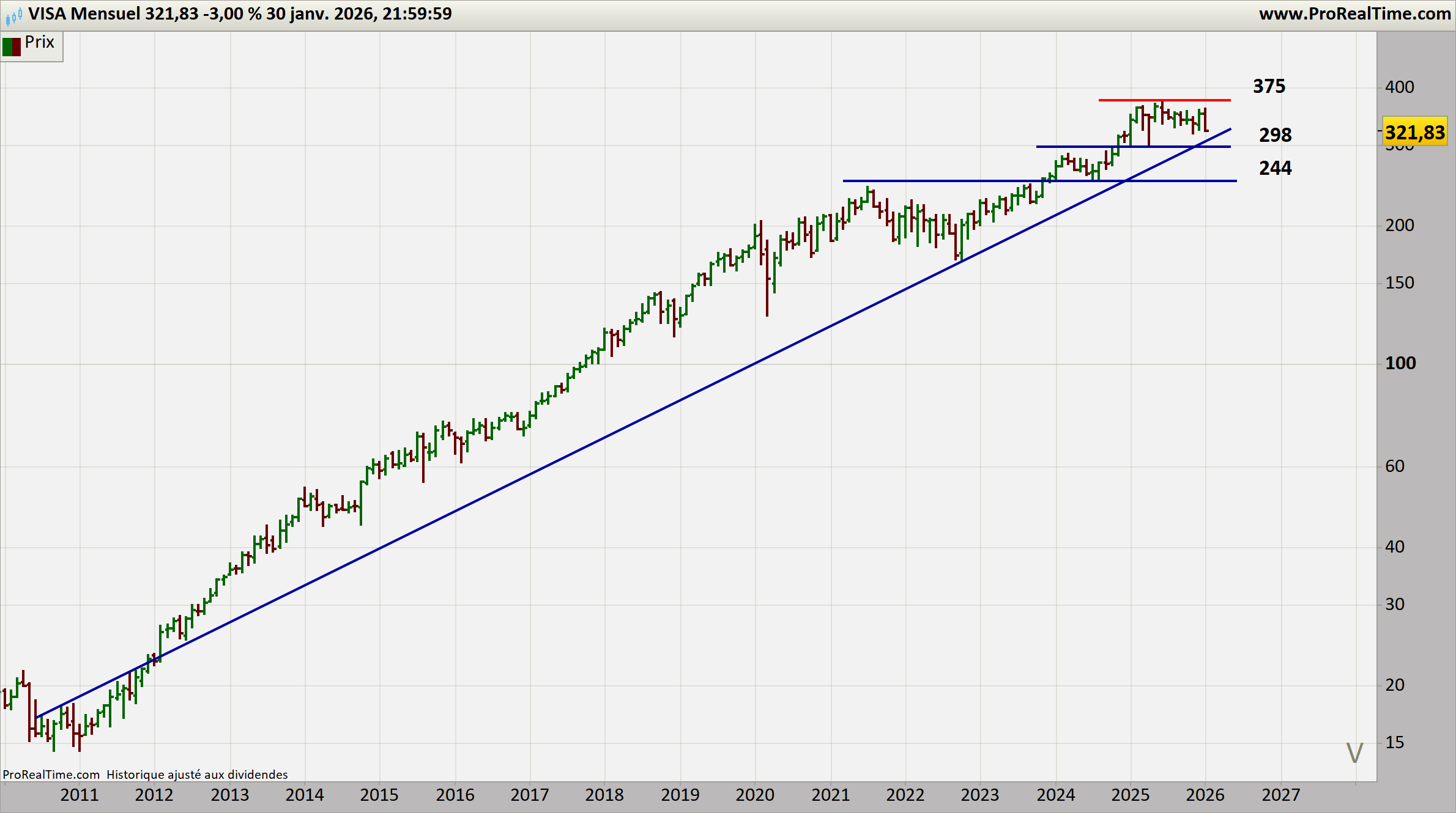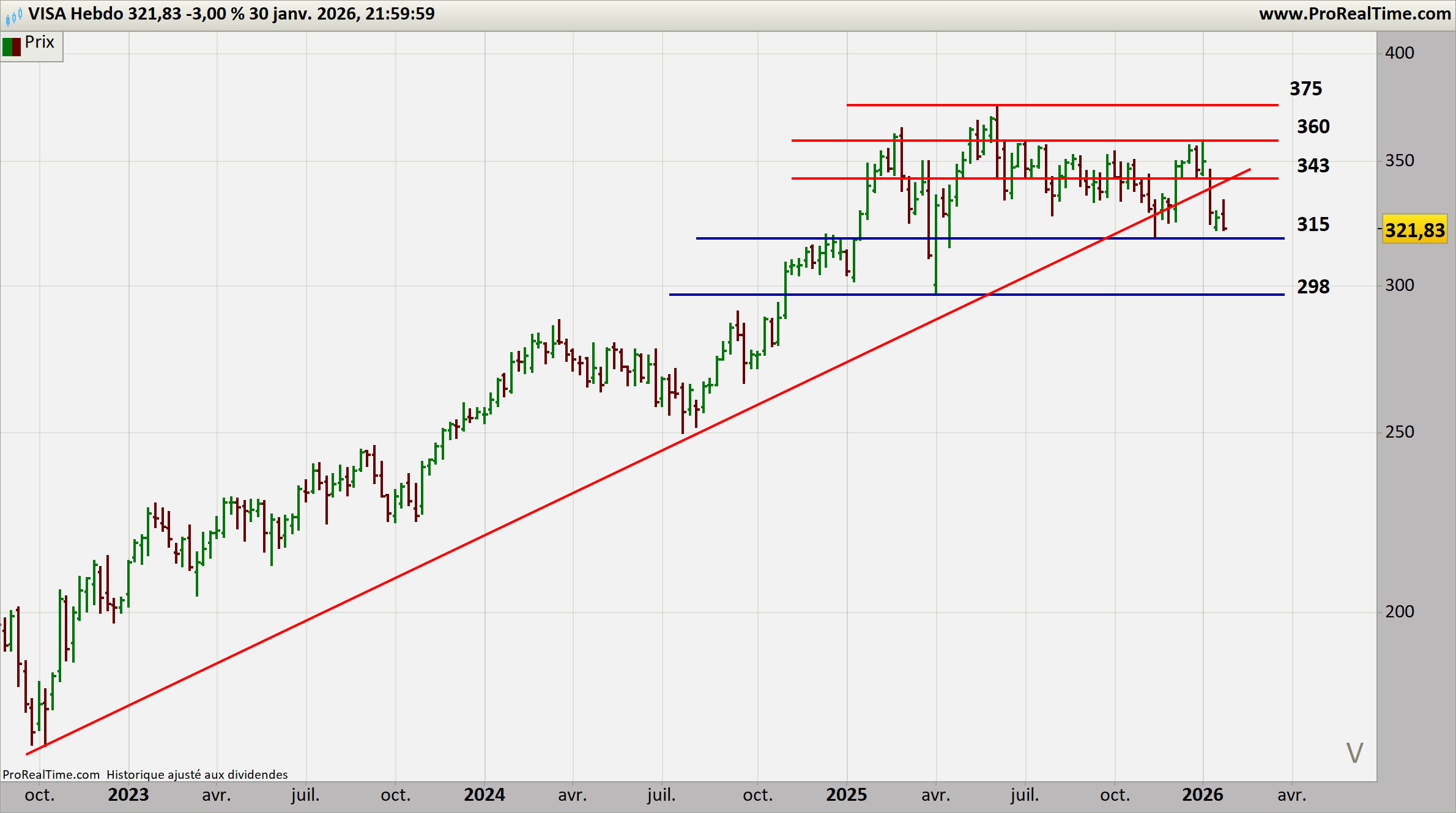Visa consolide dans une structure intermédiaire après un long cycle haussier. Le support 315 USD est le pivot majeur à préserver. La cassure de 343 USD a envoyé un premier signal de faiblesse, ouvrant la voie à une zone d’achat plus rationnelle vers 300 USD. Le super‑cycle reste intact, mais la dynamique court terme est sous pression.